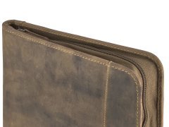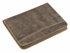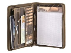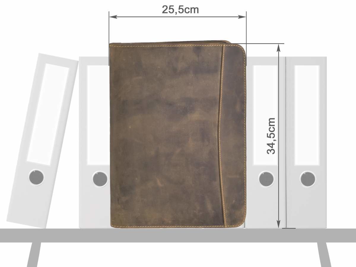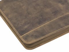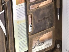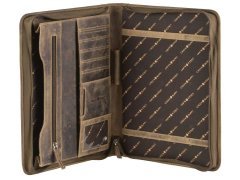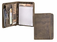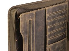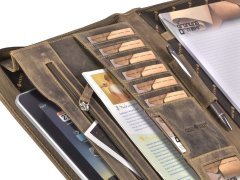 Cartella porta documenti in pelle Greenburry “Vintage” A4 con chiusura a zip su tutto il perimetro, tasca interna con zip, 5 scomparti per carte, 1 tasca trasparente, 2 tasche porta accessori, porta penne e scomparto per blocco note A4. Pelle bovina naturale marrone antico effetto “used look”. Elegante e funzionale, ideale come idea regalo.