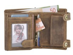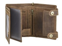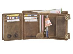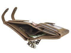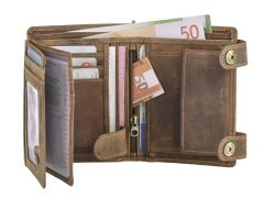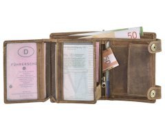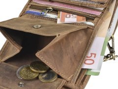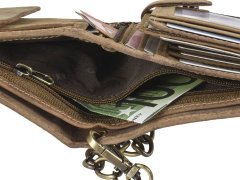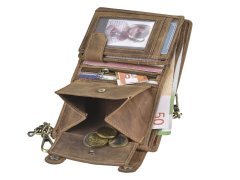 Questa resistente portafoglio da camionista è realizzata in pelle di bovino naturale con un elegante effetto “used look”. Pensata per chi è sempre in viaggio, offre massima sicurezza grazie alla catena in metallo con chiusura a bottone a pressione, removibile all’occorrenza. I numerosi scomparti, inclusi due con finestra trasparente, consentono di organizzare comodamente carte, contanti e documenti. Lo scomparto portamonete con fondo in pelle evita deformazioni anche con un uso intenso. La grande incisione di un camion sul davanti dona un tocco distintivo e autentico.